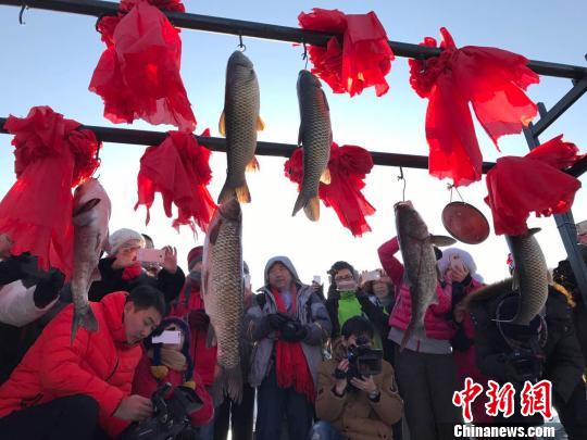 当日一早,渔民们在五大连池火山堰塞湖面上开凿出冰洞,投入了一张1200米长的渔网。四面八方的人流汇聚到祭湖醒网仪式现场,一段萨满舞表演重现了古老的祭祀文化,渔把头带领一众渔民,用他们的特有方式感谢五大连池这片神山圣水的恩赐,祈求今年冬捕平安顺利、收获丰硕。