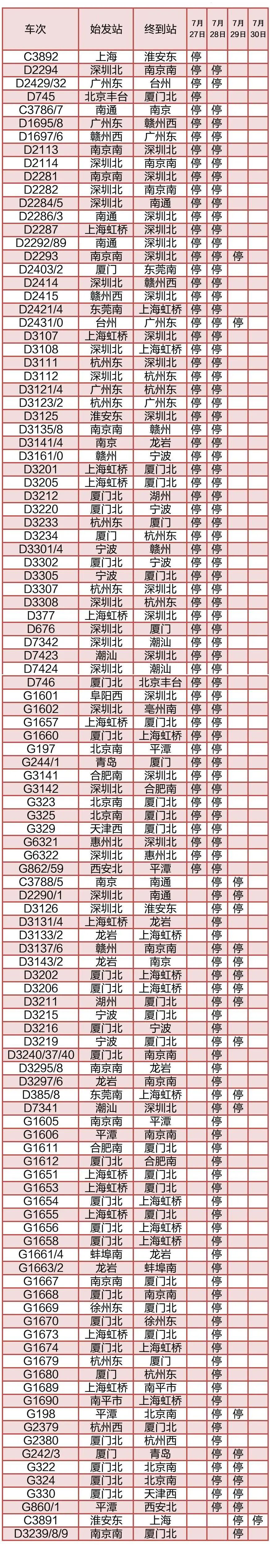 据中国铁路上海局集团有限公司消息,今天起,长三角铁路部分列车停运(截至7月26日22时部分停运列车车次信息见附表)。