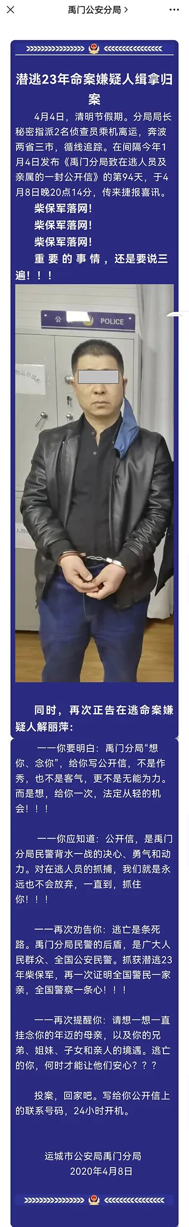 2020年1月4日,禹门分局局长发布一篇《禹门分局致在逃人员及亲属的一封公开信》,规劝在逃命案嫌疑人解丽萍及柴保军投案自首。