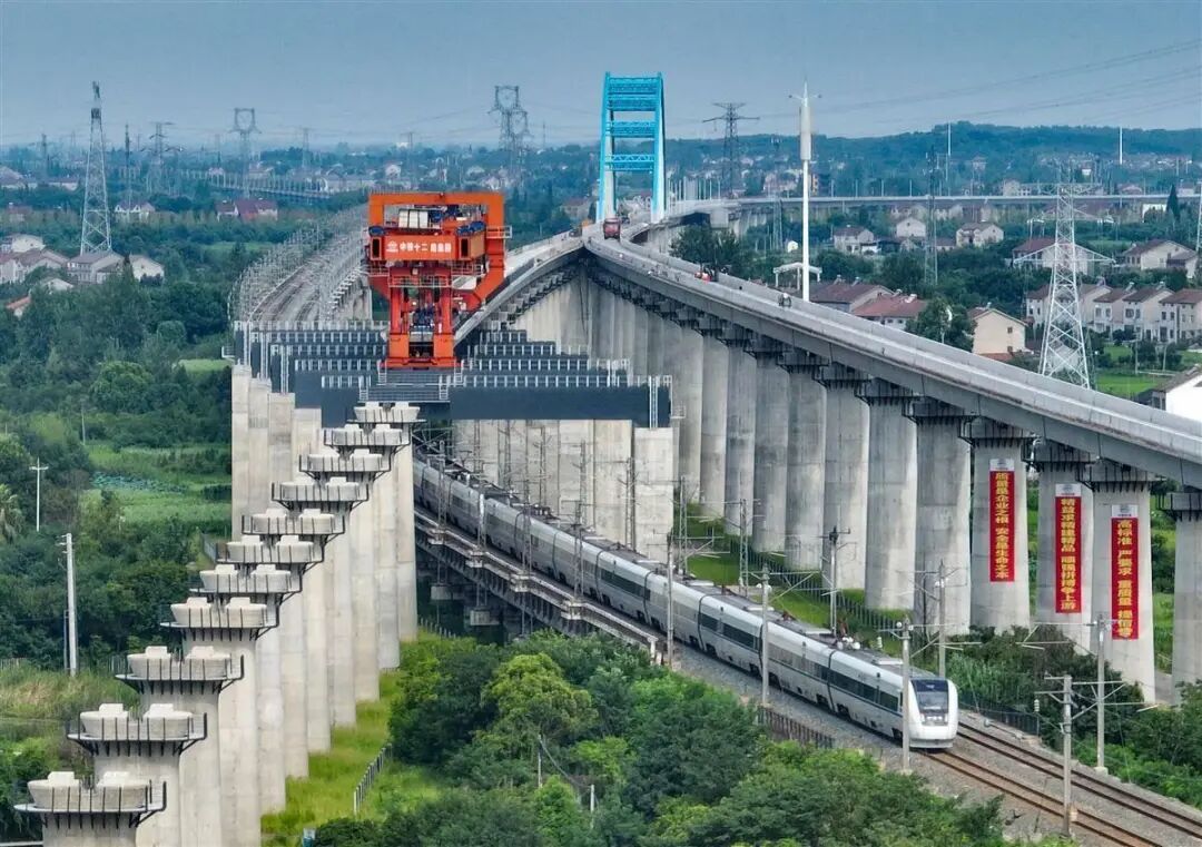 架设工程难度极大。据悉,荆荆铁路有6孔上跨汉宜铁路,倾斜角度仅7.2度,建设者需利用6个Ⅱ级、11个Ⅲ级铁路封锁点内完成跨既有线施工任务。
