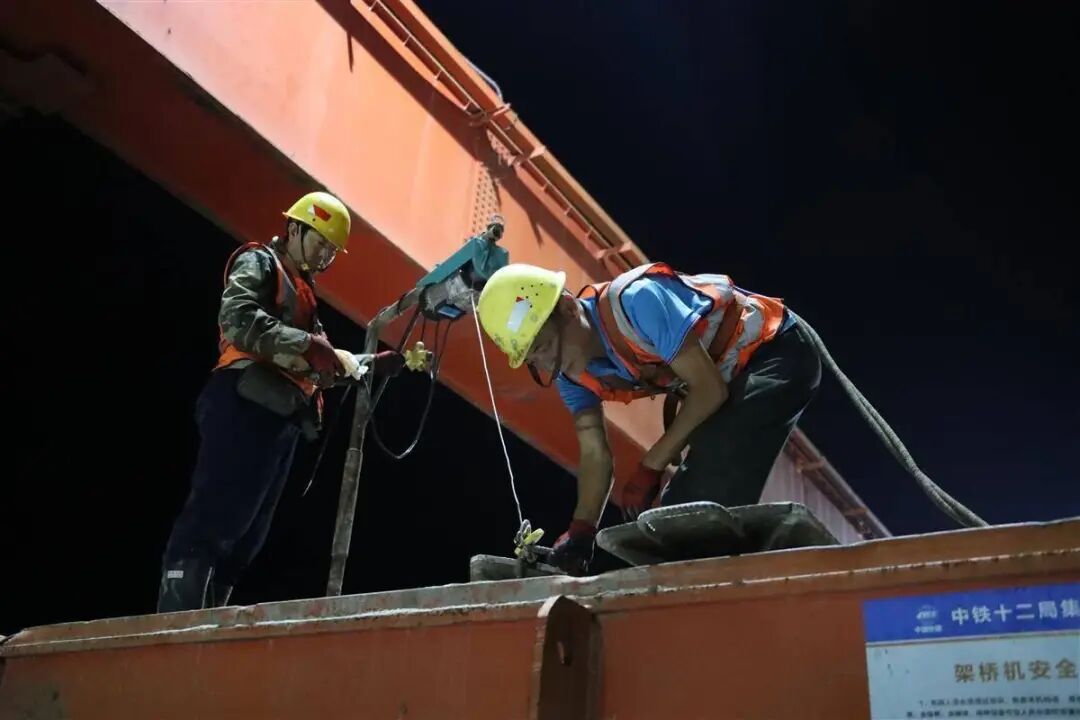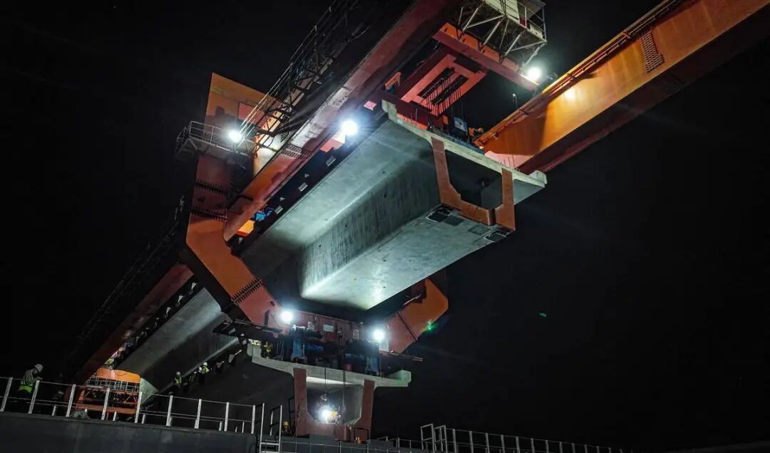 20多米的高空上,头灯如星光闪动,20多名操作手紧张忙碌,完成牵引设备等任务。此前,最后一榀长32米、重390吨的箱梁已由6公里外的梁场运至现场。只见架桥机发出轰鸣声舒展“后肢”,将运梁车运送的箱梁拥入“怀中”。这一过程被称作“喂梁”,是架设箱梁的关键环节。