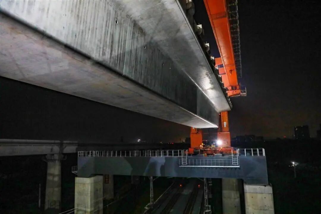 “你看,荆荆铁路的盖梁离汉宜铁路接触网仅1.7米,让箱梁平稳穿越它,就像是戴着脚镣跳舞。”夜色中,顺着赵文贵手指方向看,只见红色架桥机正缓缓伸出“前肢”,稳稳落在30多米远的另一墩柱上,为架设近400吨的“巨无霸”做准备。
