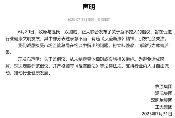 随后,四家企业发布联合声明,声明中提到,6月20日,牧原与温氏、双胞胎、正大联合发布了关于互不挖人的倡议,旨在促进行业健康文明发展,其中部分表述表意不当,有违《反垄断法》精神,引发社会关注。