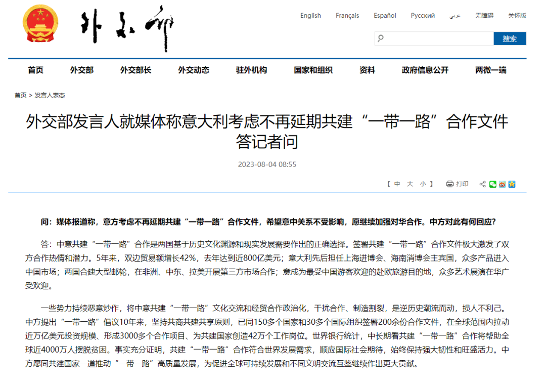 据外交部网站4日消息,外交部发言人就媒体称意大利考虑不再延期共建“一带一路”合作文件答记者问时表示,一些势力持续恶意炒作,将中意共建“一带一路”文化交流和经贸合作政治化,干扰合作、制造割裂,是逆历史潮流而动,损人不利己。