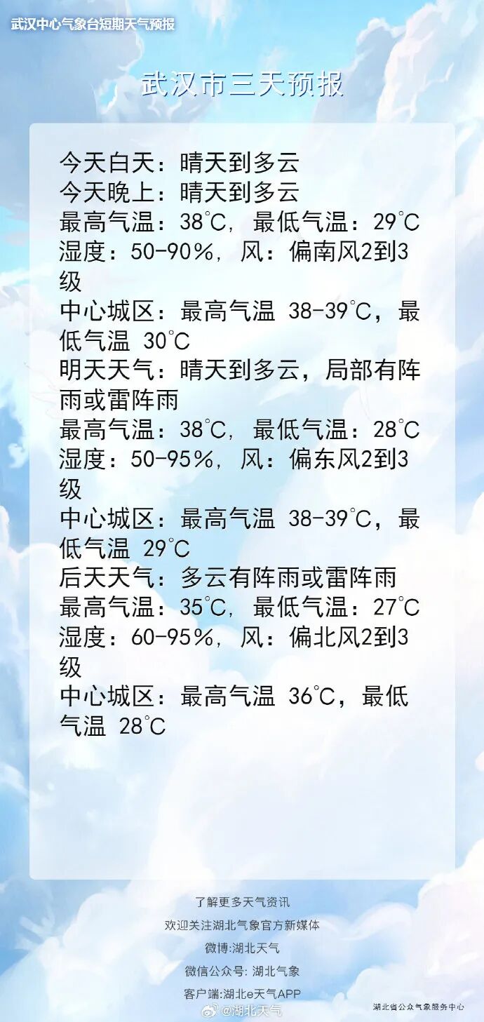 另据湖北省气象局消息,预计今明两天,我省受副热带高压控制,仍以晴热高温天气为主,局部有阵雨或雷阵雨。其中今天大部地区最高气温36~38℃,局部39℃以上,明天鄂西北受雨水影响,略有降温,其他大部地区最高气温36~38℃,局部39℃以上。