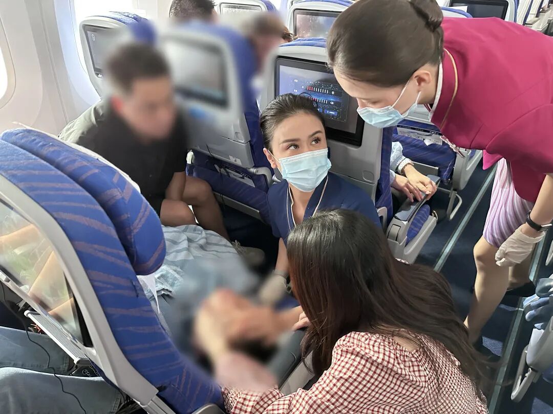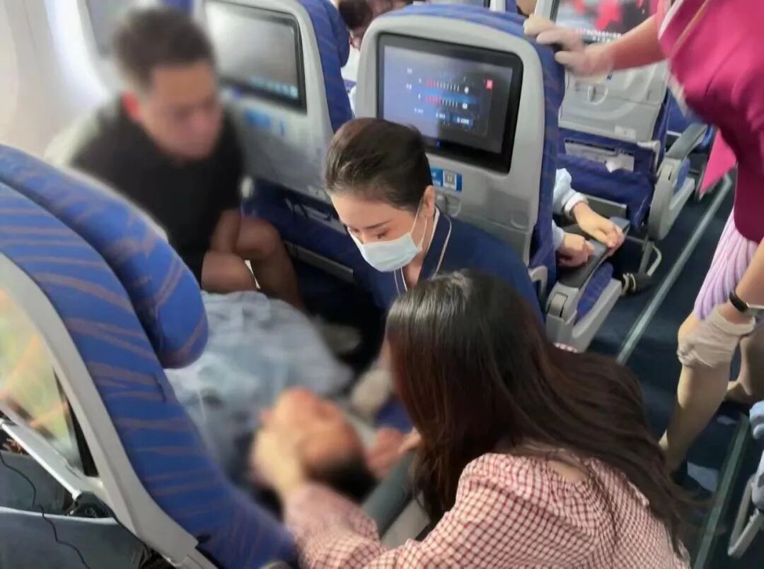 乘务组分工合作,将同排座位旅客调整到其他空位,让孩子得以平躺下来,并且取出机载氧气瓶备用。此时,机上有一位来自广州中医药大学第一附属医院的医生黄运旋听到广播后,主动表明身份,前来协助。