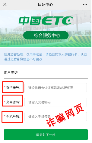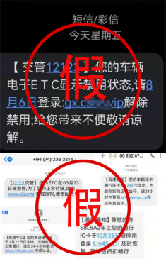 诈骗分子以ETC中心、高速管理中心等机构名义发送短信,打着“你的ETC无法继续使用,想要恢复使用就要重新认证”的借口进行诈骗。