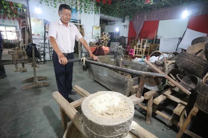 长江村村民王学荣虽然已经72岁,推起石磨来可不含糊。“现在也就在小覃这里看到我们熟悉的老物件啦!”王学荣说,“以前推磨是为了生活,现在则是怀旧。”