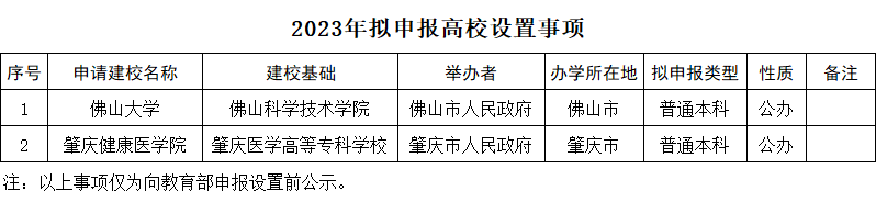 《公示》称,为做好2023年拟申报高校设置事项相关工作,经广东省高等学校设置评议委员会专家考察和评议,对拟向教育部申报的佛山科学技术学院更名佛山大学、以肇庆医学高等专科学校为基础设置肇庆健康医学院等2个事项予以公示。公示时间为2023年8月7日~2023年8月11日。