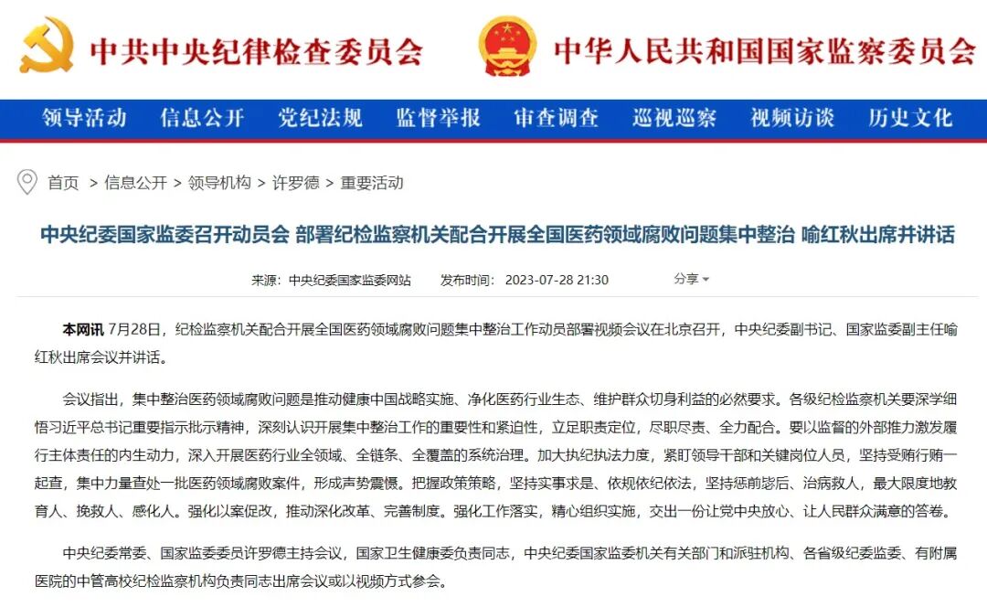 国家卫健委网站7月21日发布消息,国家卫生健康委会同教育部、公安部、审计署、国务院国资委、市场监管总局、国家医保局、国家中医药局、国家疾控局、国家药监局,十个部门联合召开视频会议,部署开展为期1年的全国医药领域腐败问题集中整治工作。 7月28日,纪检监察机关配合开展全国医药领域腐败问题集中整治工作动员部署视频会议在北京召开。会议指出,集中整治医药领域腐败问题是推动健康中国战略实施、净化医药行业生态、维护群众切身利益的必然要求。