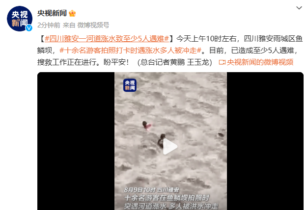 痛心!已有5人遇难 2023-08-09 14:34 中国新闻网 0 据央视新闻消息,9日上午10时左右,四川雅安雨城区鱼鳞坝,十余名游客拍照打卡时遇涨水多人被冲走。目前,已造成至少5人遇难,搜救工作正在进行。