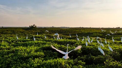 广西北海市合浦县沙岗镇七星岛的一片红树林,鹭鸟歇息、戏飞,构成一幅唯美的生态画卷。林启波摄(影像中国)