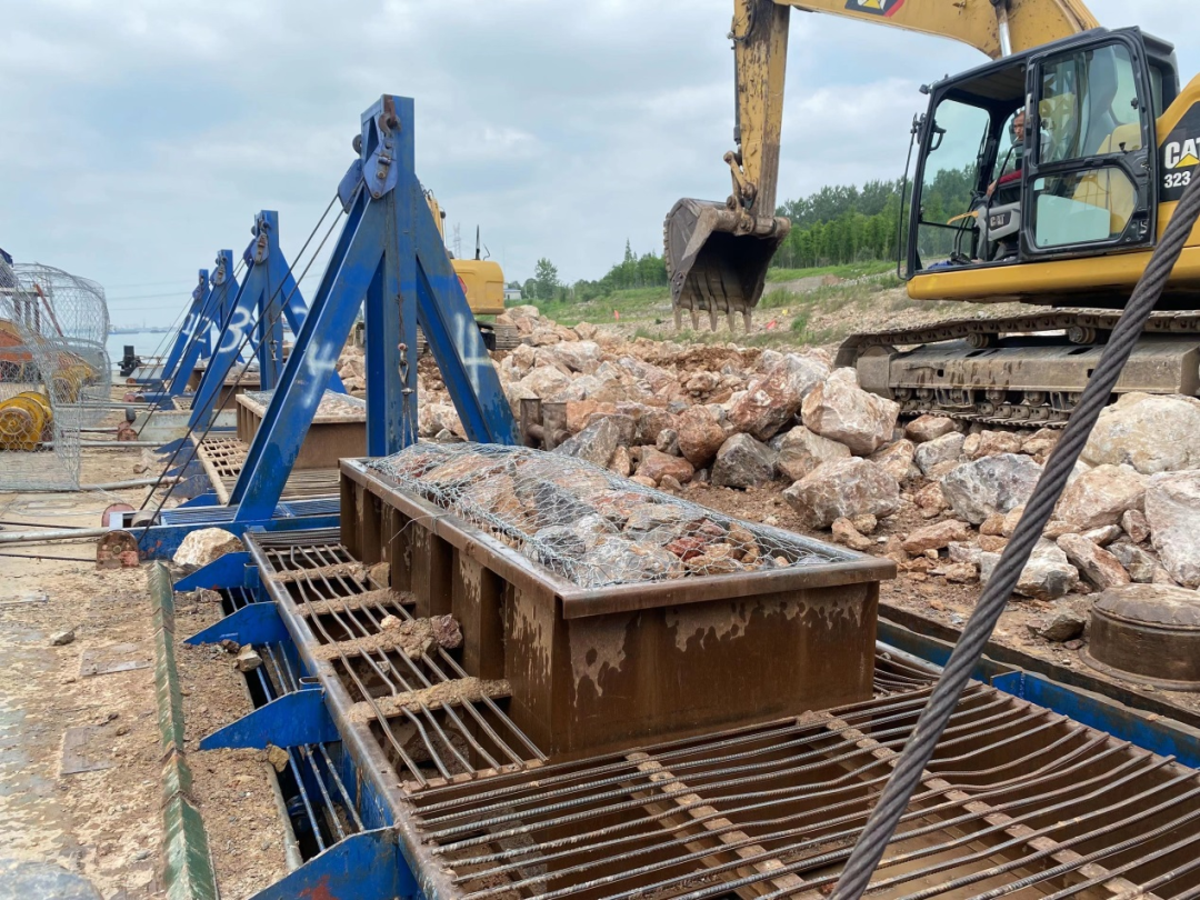 该标段建设地点位于对应荆江大堤桩号江左741+810至738+700,施工长度3110米。其主要建设内容为水下抛石、水下抛投钢丝网网兜石笼以及网模卵石排沉放,这几项工程措施抗冲能力强、柔性好,能适应岸坡和河床变形,其主材均采用天然砂卵石和土工材料,取材容易,环保节能。自今年4月2日动工以来,该标段共完成抛石47134.19m³,钢丝网石笼30607.5m³,网模卵石排面积170136m²。