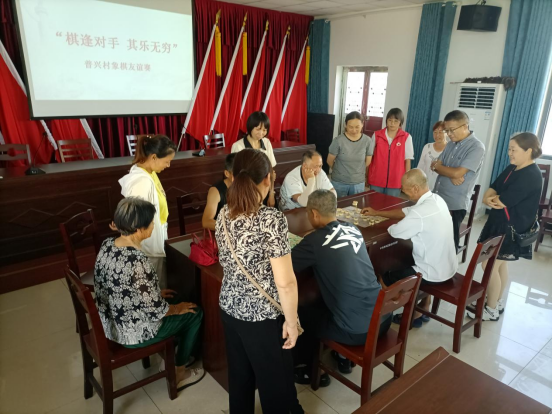 另一边,村委会二楼会议室内也上演着一场“楚河汉界”的精彩对弈,两组象棋参赛选手面对棋局思路敏捷、下手果断,落子声此起彼伏,围观村民也积极主动地交流看法、探讨棋局,充分展现了“友谊第一,比赛第二”的精神风貌。