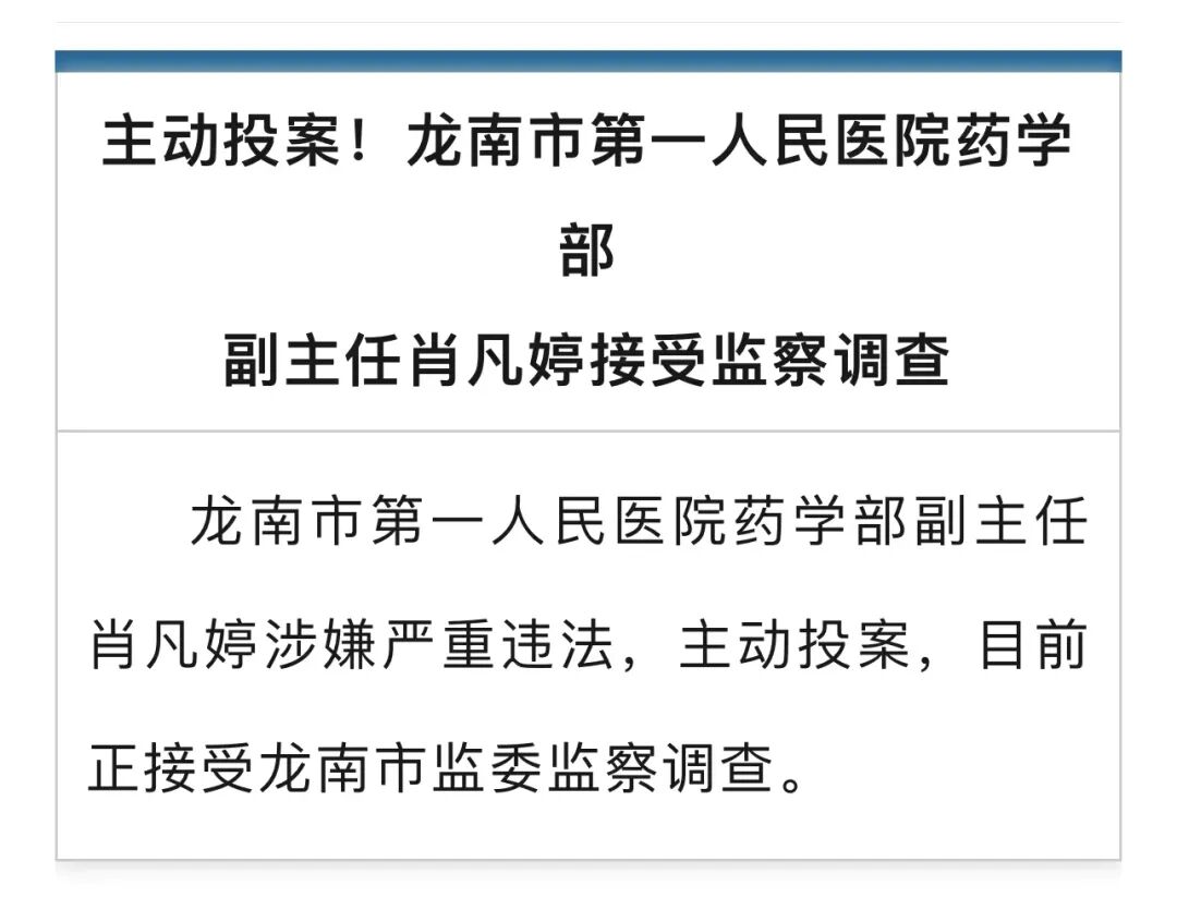 据微信公众号“清廉赣州”消息,江西赣州龙南市第一人民医院药学部副主任肖凡婷涉嫌严重违法,主动投案,目前正接受龙南市监委监察调查。