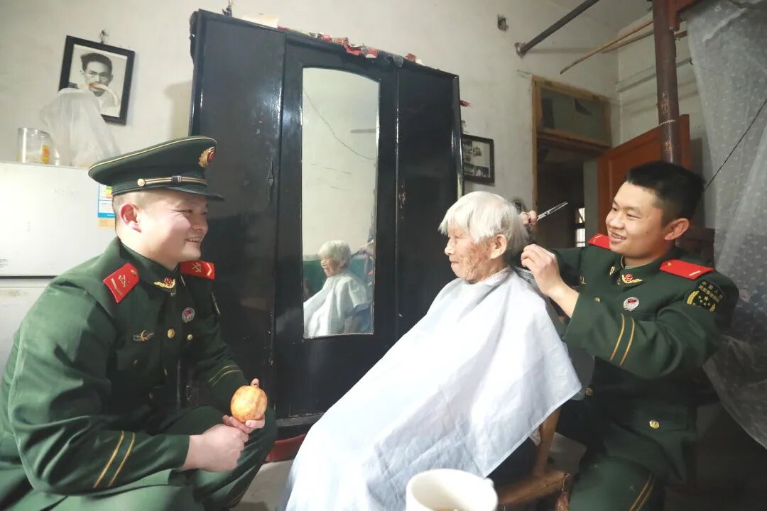 官兵们了解赵奶奶是在十年前的一个下午,该中队指导员正在组织体能训练,无意间发现一位耄耋老人背着一袋东西在营区边上艰难前行,于是赶忙上前帮忙,经询问得知,老人名叫赵金莲,已90岁高龄,住在营区附近的一处工人宿舍,儿女因工作原因常年不在身边,独自一人生活。“我们是邻居,您年龄大了不方便,以后这样的重活,我们来帮您。”指导员贴心地说。随后,指导员又将赵金莲老人的事告诉了全体官兵,发起了帮带倡议活动,官兵们纷纷响应,经常利用周末休息时间到老人家中帮忙做家务、为老人理发。赵金莲老人看在眼里、感激在心里。