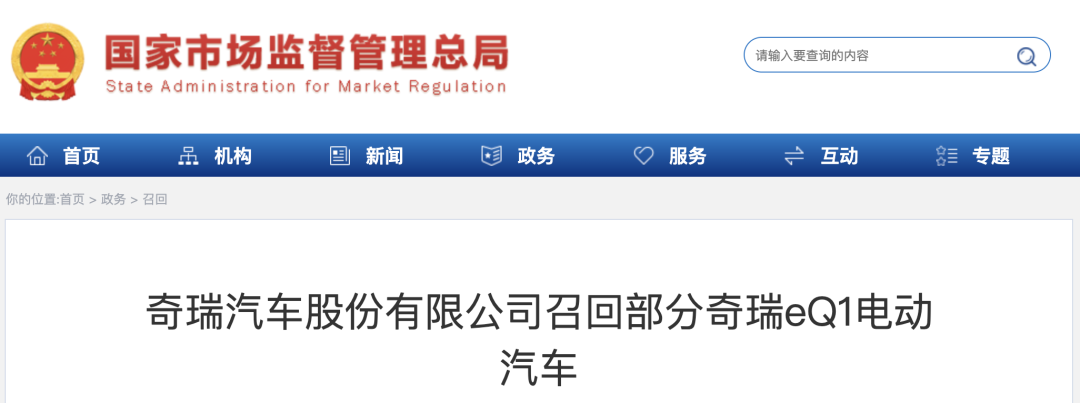日前,奇瑞汽车股份有限公司根据《缺陷汽车产品召回管理条例》和《缺陷汽车产品召回管理条例实施办法》的要求,向国家市场监督管理总局备案了召回计划。决定自即日起,召回2016年12月3日至2018年2月9日生产的部分奇瑞eQ1电动汽车,共计20063辆。