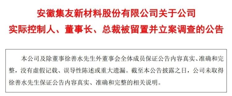 今年1月29日,集友股份公告,公司于1月20日(农历腊月二十九)收到重庆市巴南区监察委员会签发的“关于对公司实际控制人、董事长、总裁徐善水个人因涉嫌行贿而被留置并立案调查的通知书”。