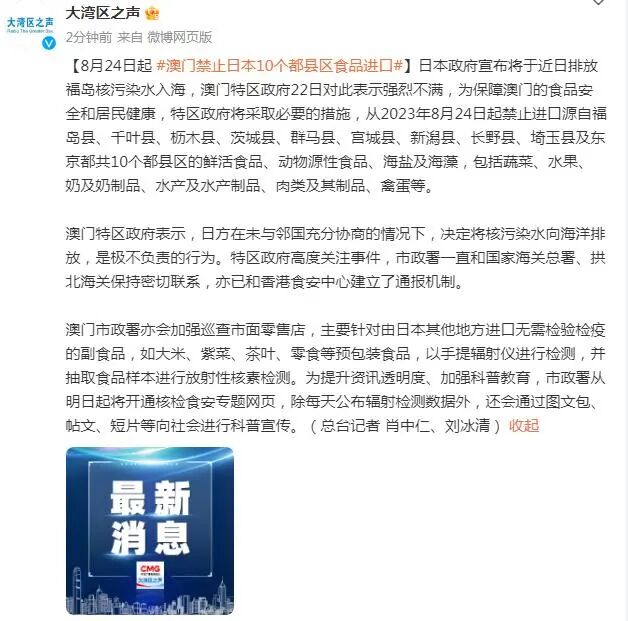 日本政府宣布将于近日排放福岛核污染水入海,澳门特区政府22日对此表示强烈不满,为保障澳门的食品安全和居民健康,特区政府将采取必要的措施,从2023年8月24日起禁止进口源自福岛县、千叶县、枥木县、茨城县、群马县、宫城县、新潟县、长野县、埼玉县及东京都共10个都县区的鲜活食品、动物源性食品、海盐及海藻,包括蔬菜、水果、奶及奶制品、水产及水产制品、肉类及其制品、禽蛋等。