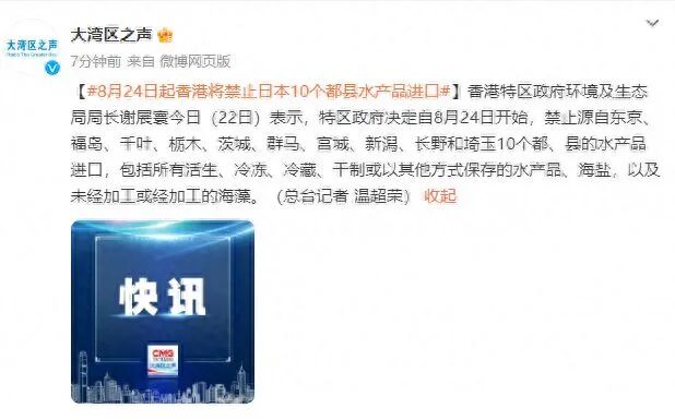 香港特区政府环境及生态局局长谢展寰今日(22日)表示,特区政府决定自8月24日开始,禁止源自东京、福岛、千叶、栃木、茨城、群马、宫城、新潟、长野和埼玉10个都、县的水产品进口,包括所有活生、冷冻、冷藏、干制或以其他方式保存的水产品、海盐,以及未经加工或经加工的海藻。