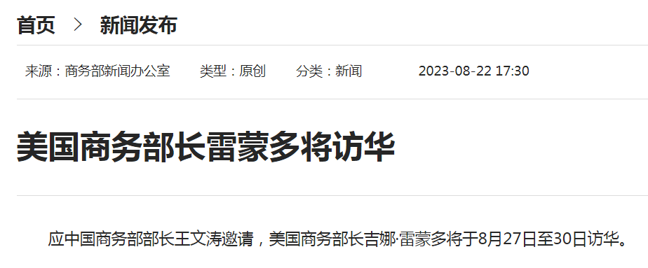 商务部网站消息:应中国商务部部长王文涛邀请,美国商务部长吉娜·雷蒙多将于8月27日至30日访华。