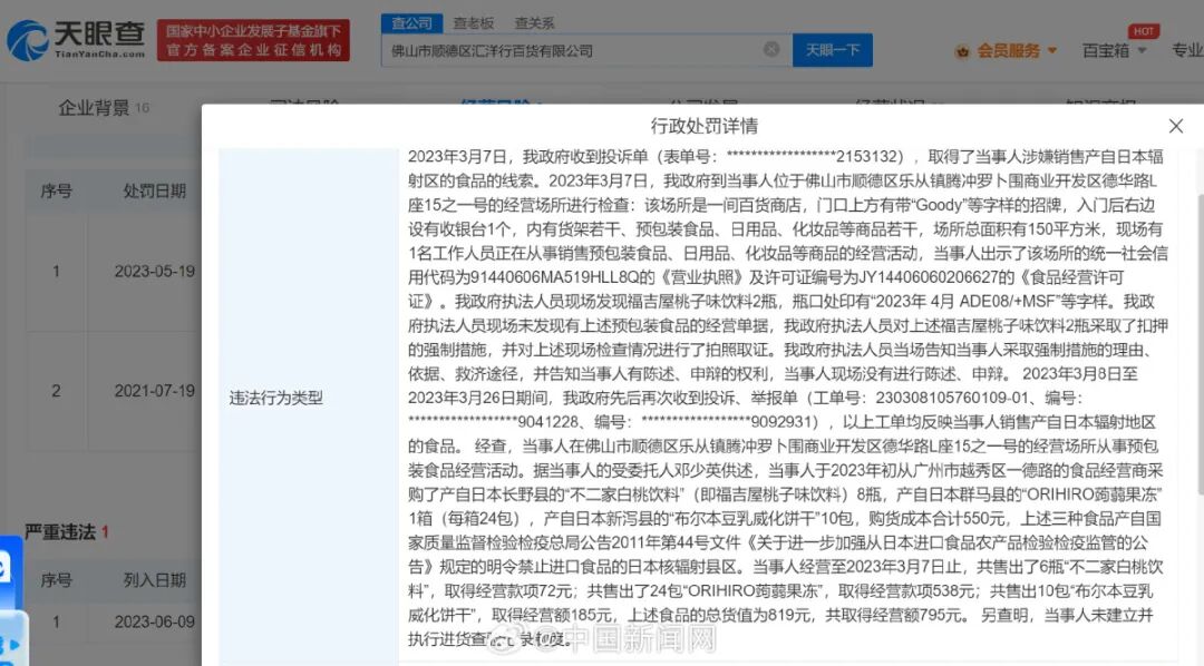 天眼查显示,曾有多个商家售卖日本核辐射区食品饮料被处罚。