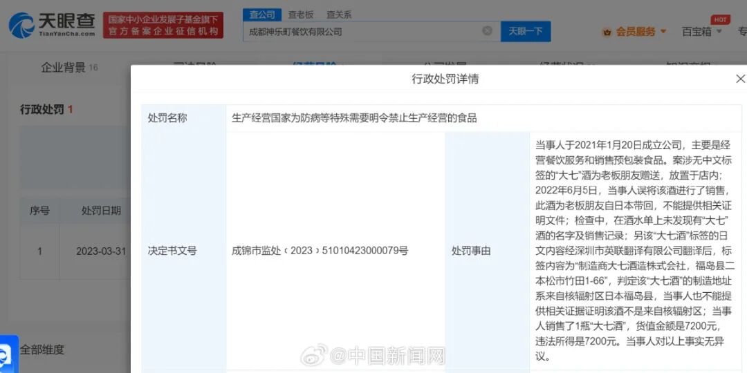 成都神乐町餐饮有限公司因销售来自核辐射区日本福岛县的“大七酒”被罚款3万;