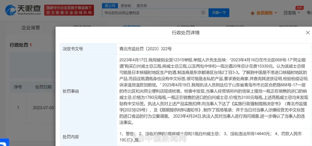 青岛市市北区和光同尘便利店因涉嫌销售日本核辐射地区生产的威士忌酒被罚款1.9万余元。