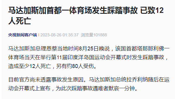 据央视新闻客户端消息,马达加斯加总理恩蔡当地时间8月25日晚说,该国首都塔那那利佛一体育场当天在举行第11届印度洋岛国运动会开幕式时发生踩踏事故,造成至少12人死亡,另有约80人受伤。目前官方尚未透露事故发生原因。马达加斯加总统拉乔利纳随后在运动会开幕式上宣布,为此次踩踏事故遇难者默哀一分钟。