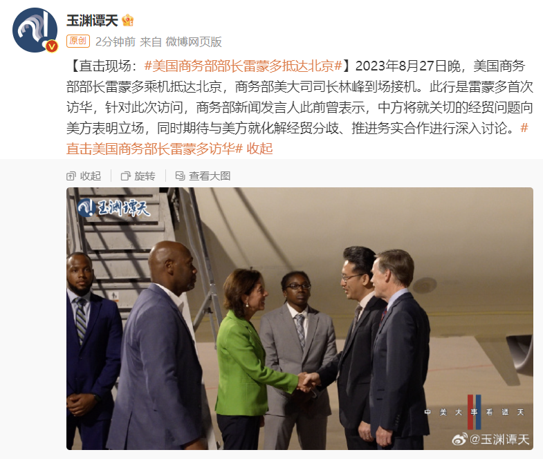 据玉渊谭天微博27日消息,2023年8月27日晚,美国商务部部长雷蒙多乘机抵达北京,商务部美大司司长林峰到场接机。此行是雷蒙多首次访华,针对此次访问,商务部新闻发言人此前曾表示,中方将就关切的经贸问题向美方表明立场,同时期待与美方就化解经贸分歧、推进务实合作进行深入讨论。
