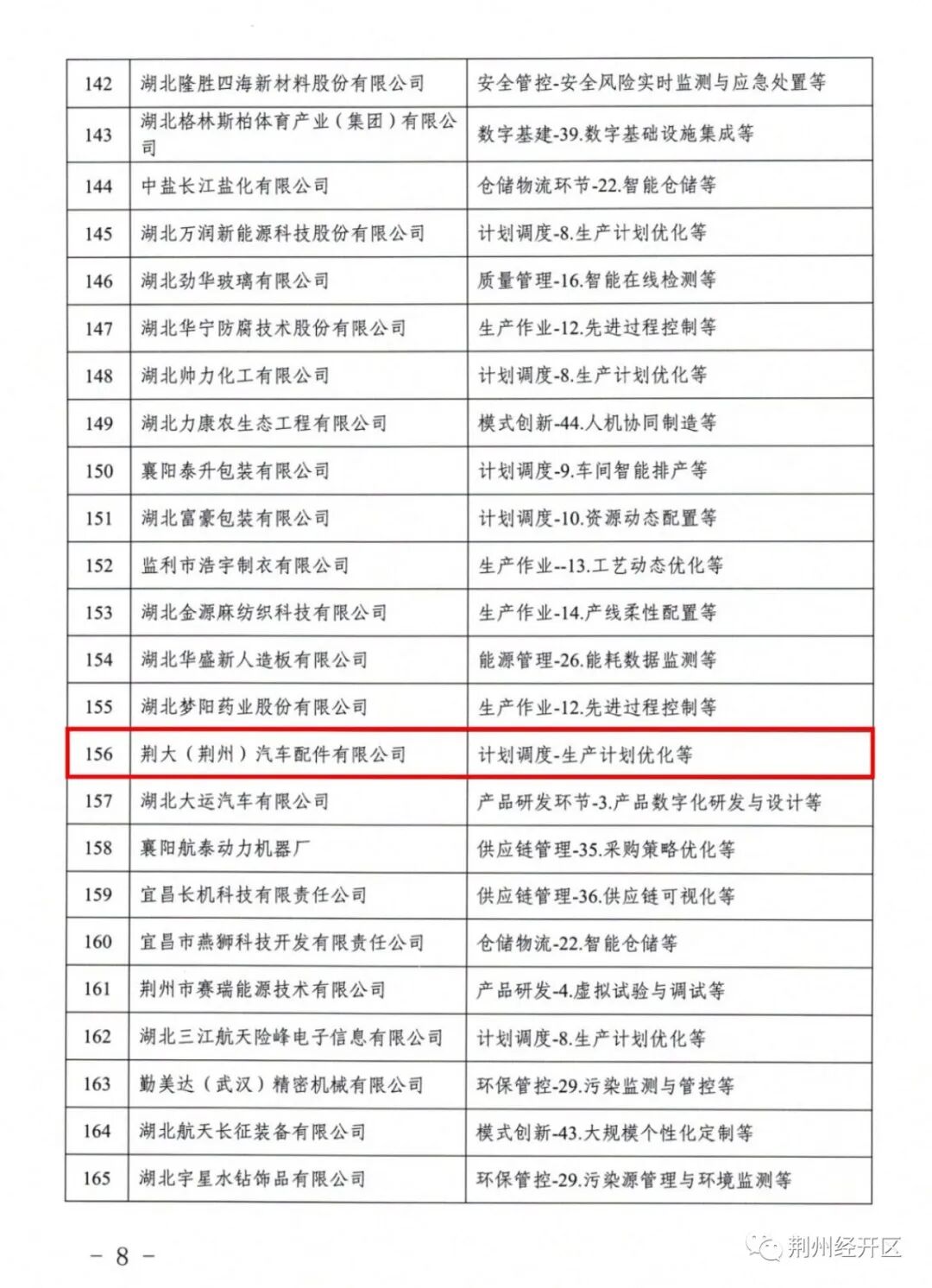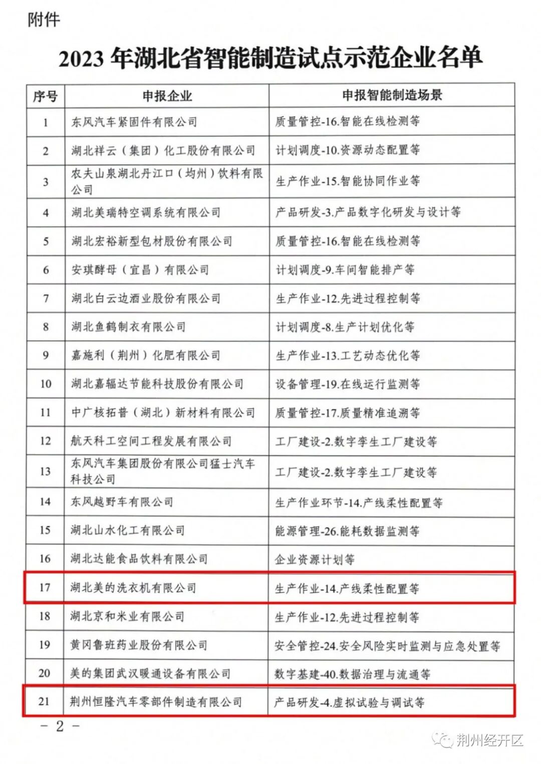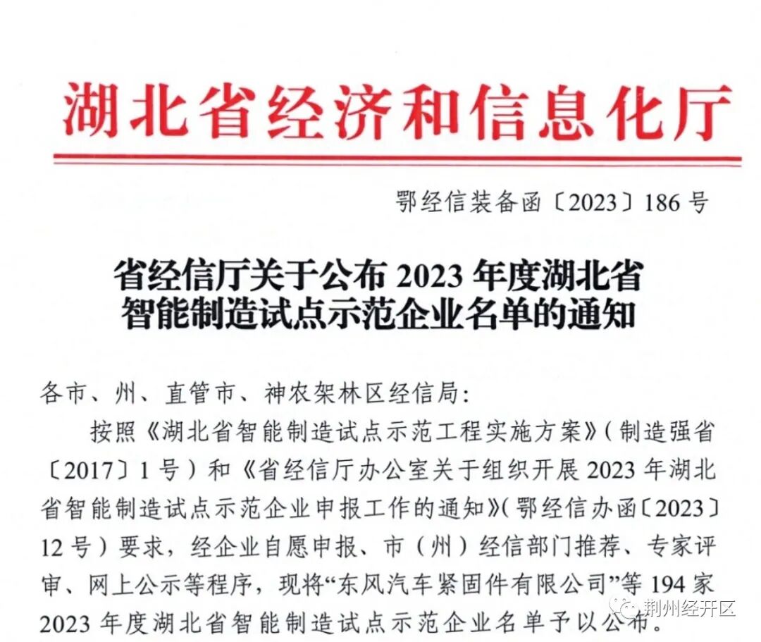 近日,湖北省经济和信息化厅正式公布2023年度湖北省智制造试点示范企业名单,荆州经开区7家企业上榜(详情见名单)。