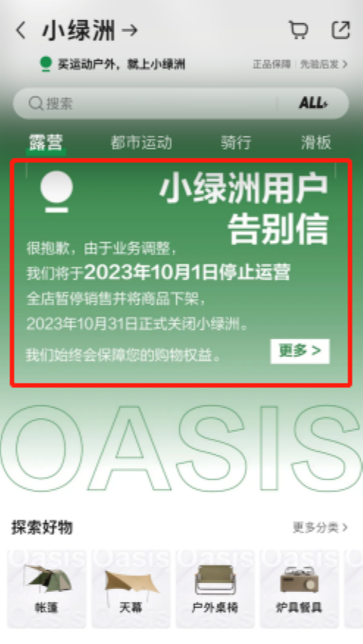 对于小绿洲关停原因,在告别信中,小红书方面表示,小绿洲在业务的探索和发展过程,没能实现最大化满足大家户外需求的预期目标。