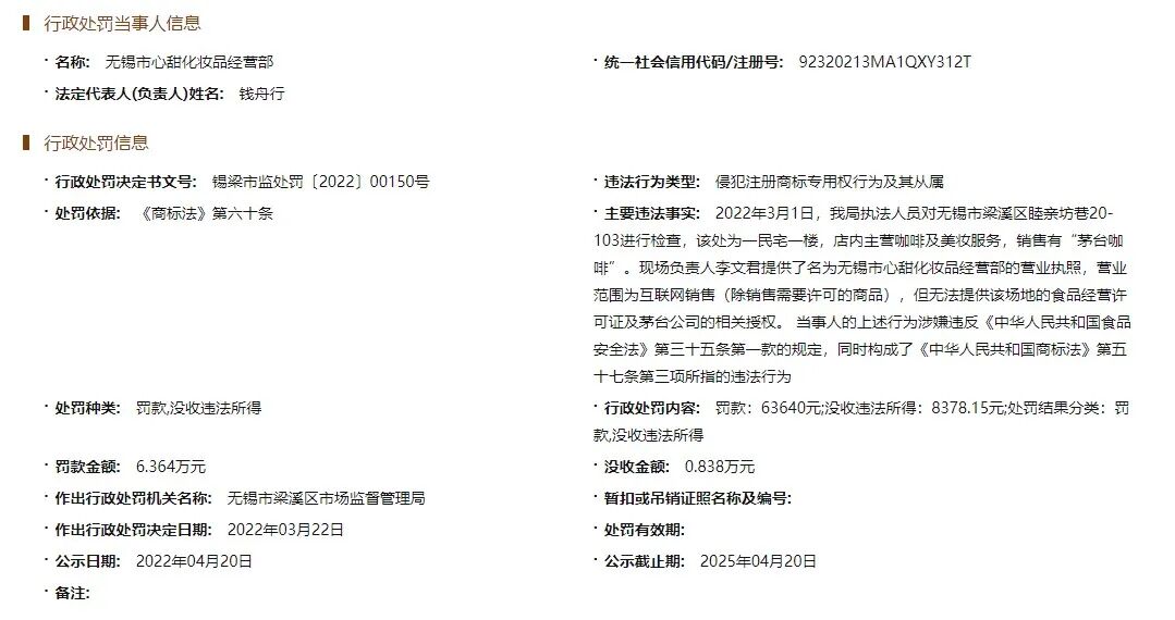同年,无锡市心甜化妆品经营部在未领取食品经营许可的情况下销售“茅台咖啡”,且在店内设置“专属特调茅台咖啡 53°¥128”“咖啡天花板玖号 53°飞天茅咖”等宣传牌,被无锡市梁溪区市场监督管理局没收违法所得8378.15元,并处以罚款63640元。