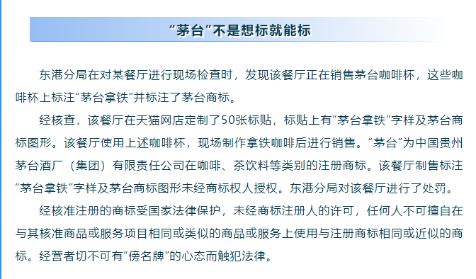 中新财经注意到,2022年,无锡市锡山区市场监督管理局公布的典型案例显示,某餐厅因售卖标注“茅台拿铁”及茅台商标的咖啡杯而被处罚。