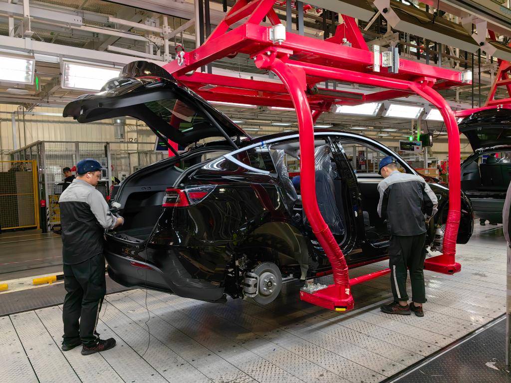 在特斯拉上海超级工厂,工人在车间内忙碌。新华社记者周蕊 摄