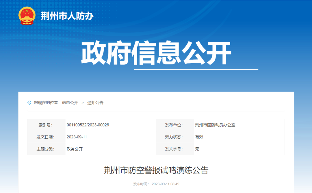 经市政府同意,定于2023年9月18日10时至10时30分,在全市组织防空警报试鸣演练,目的在于让广大市民熟悉防空袭警报信号、“勿忘国耻,铭记历史”,增强国防观念和防空防灾意识,敬请广大市民保持正常工作和生活秩序。