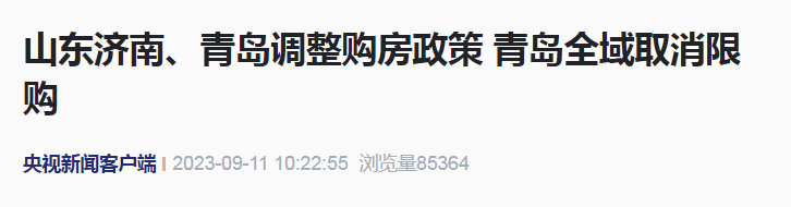 据央视新闻客户端消息,11日,山东济南市、青岛市相继调整购房政策。自2023年9月11日起,山东济南取消二环以内的历下区、市中区区域购房限制,同时,商品住房取得《不动产权证书》后即可上市交易。山东青岛也发布相关通知:全域取消限购政策,商品住房取得《不动产权证书》可上市交易。