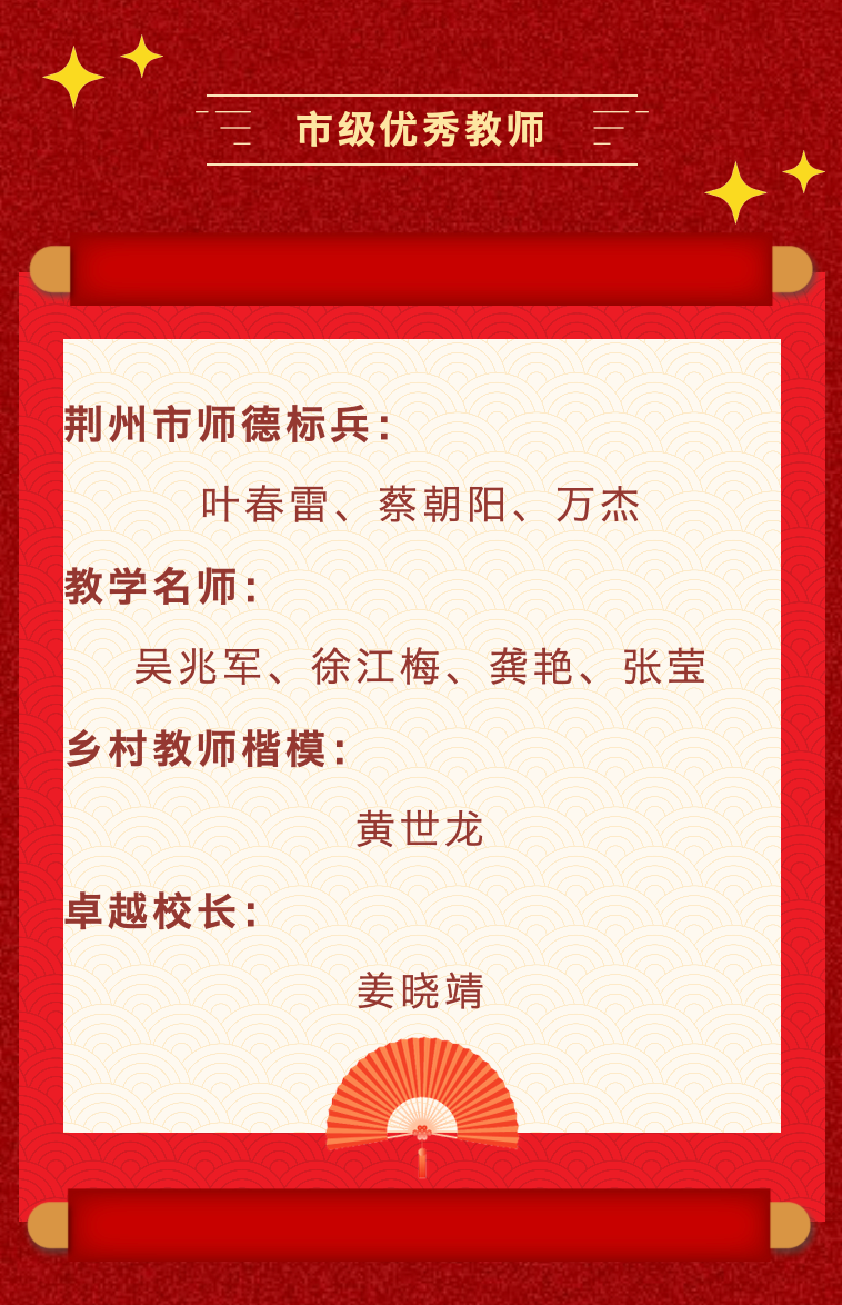 此次参加活动的优秀教师代表中,有几十年如一日、无怨无悔扎根基层的乡村教师,有锐意创新、倾心课改的教学名师,有修身立德、诲人不倦的师德典范,有起早贪黑、扎根班级建设的优秀班主任……他们的故事是全区教职工躬耕教坛、潜心教学的生动体现,更是荆州区教育高质量发展、办好人民满意教育的崭新答卷。