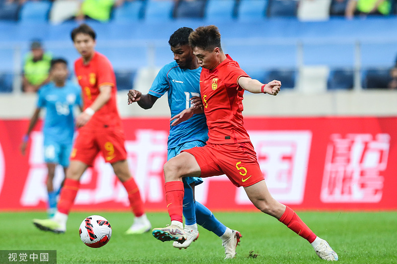 2023年9月9日,辽宁大连,2023 U23亚洲杯外围赛G组第2轮,乃比江绝杀陶强龙点射,中国2-1印度。朱越拼抢。图源:视觉中国