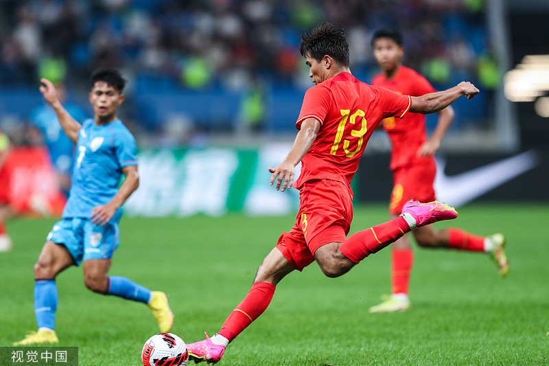 2023年9月9日,辽宁大连,2023 U23亚洲杯外围赛G组第2轮,乃比江绝杀陶强龙点射,中国2-1印度。乃比江起脚。图源:视觉中国