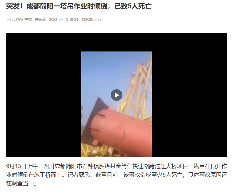 成都突发!已致5人死亡 2023-09-13 20:58 人民日报 0 9月13日上午,四川成都简阳市石钟镇胜锋村金简仁快速路跨沱江大桥项目一塔吊在顶升作业时倾倒在施工桥面上。记者获悉,截至目前,该事故造成至少5人死亡,具体事故原因还在调查当中。