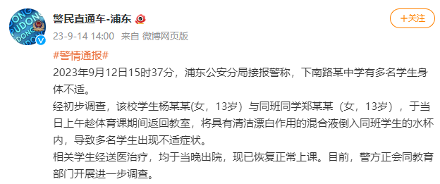 经初步调查,该校学生杨某某(女,13岁)与同班同学郑某某(女,13岁),于当日上午趁体育课期间返回教室,将具有清洁漂白作用的混合液倒入同班学生的水杯内,导致多名学生出现不适症状。