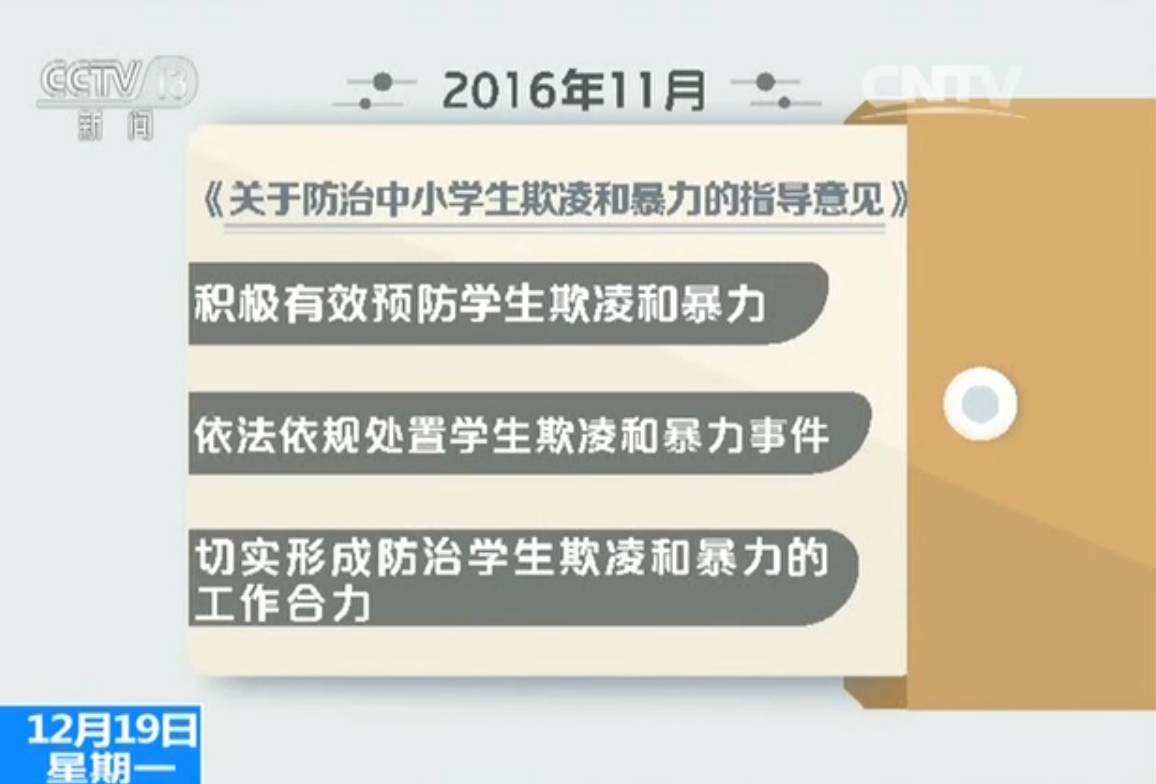 2016年11月,教育部等九部门出台《关于防治中小学生欺凌和暴力的指导意见》,意见从积极有效预防学生欺凌和暴力 、依法依规处置学生欺凌和暴力事件、切实形成防治学生欺凌和暴力的工作合力三方面,来切实防治学生欺凌和暴力事件的发生。