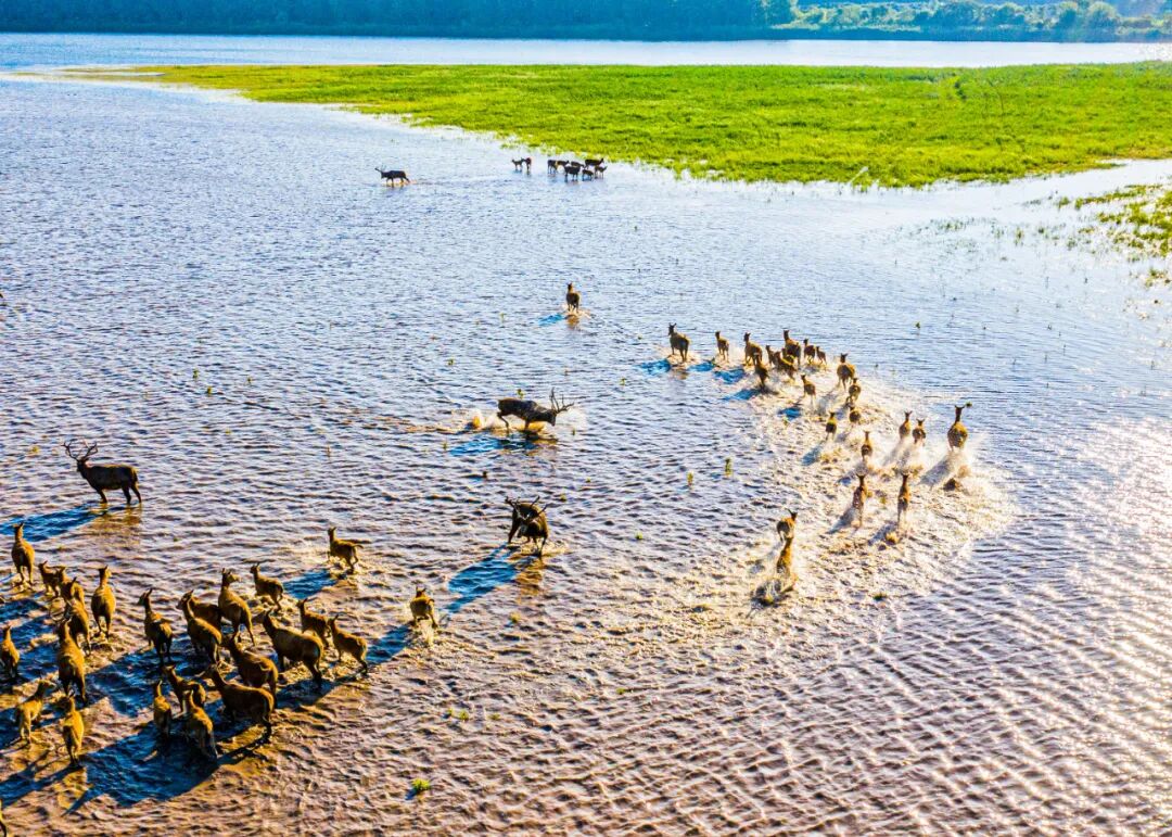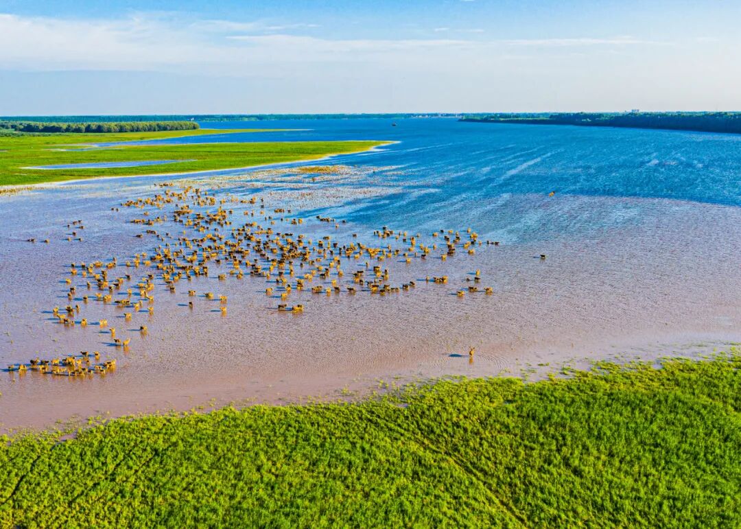 9月13日,在石首麋鹿国家级自然保护区,成群结队的麋鹿在湿地里觅食休息,姿态悠闲;而在石首长江天鹅洲白鱀豚国家级自然保护区内,江豚欢快地在水中畅游嬉戏,十分惬意。