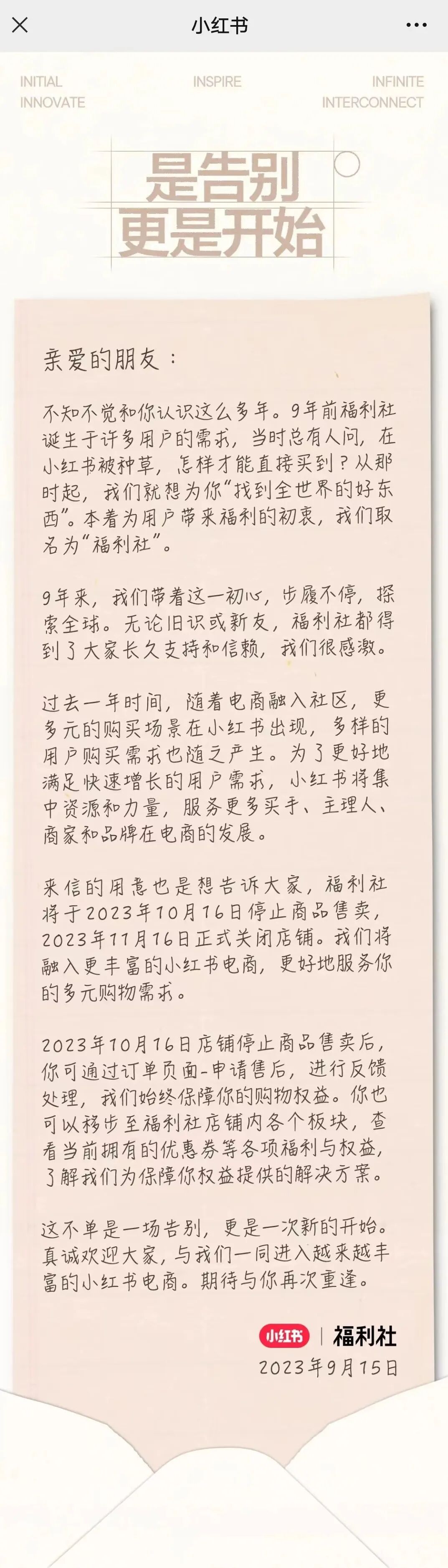 9月15日,小红书福利社发布致用户的一封信《是告别,更是开始》,表示福利社将于10月16日停止商品售卖,11月16日正式关闭店铺。