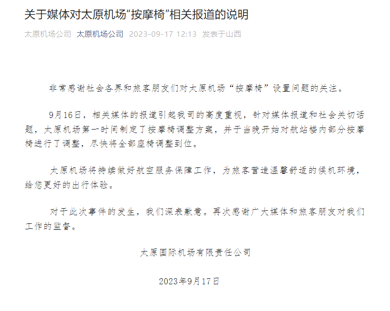 9月16日,太原机场相关工作人员回应记者称:“在201与202登机口之间确实都是统一摆放的这种按摩座椅,大概有100多个,为了整体的美观,不过其他登机口全部是正常座椅。”