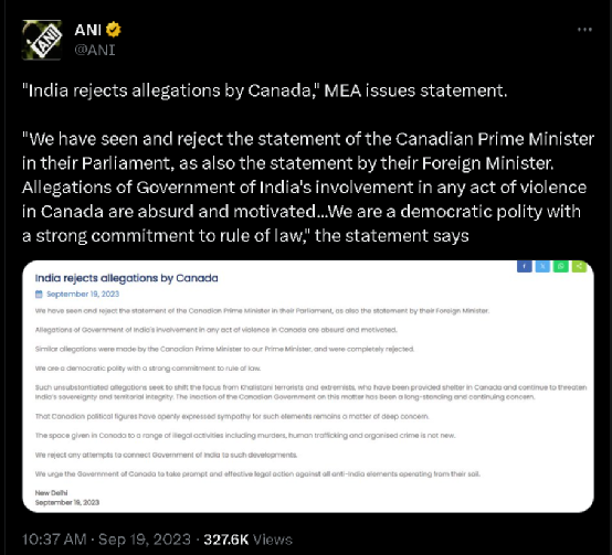 但印度政府也不甘示弱。在北京时间9月19日中午,印度外交部就在一份声明中做出了回应,不仅否认加拿大方面的指控,更称加拿大的指控“荒谬”。