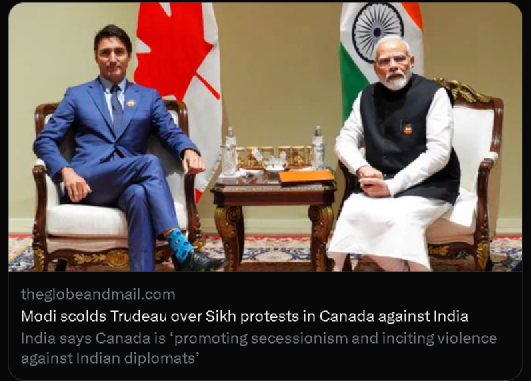 可加拿大方面往往会以这些锡克教徒已经成为加拿大人、有言论与游行集会的自由为由,无视印度的不满和抗议,反而让印度不要干涉加拿大的“内政”。这不仅直接导致两国关系陷入紧张,而且就在两周前印度举行的二十国集团(G20)峰会上,作为东道主的印度总理莫迪更是直接甩了加拿大总理特鲁多的脸,没有与他举行正式的双边会晤,仅进行了简单的非正式见面——而且,莫迪还再次向特鲁多抗议了加拿大包庇锡克教分裂势力的事情。