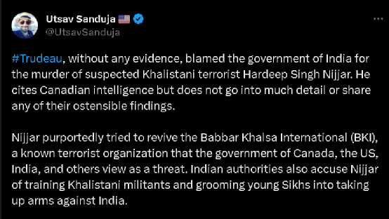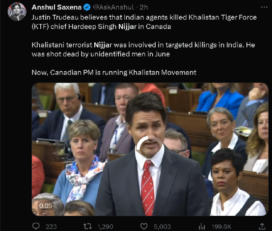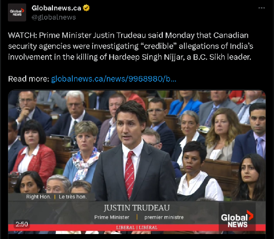 或许是因为这次不愉快的会面惹恼了特鲁多,在当地时间周一加拿大的议会会议上,特鲁多就直接甩出了一个针对印度的重磅炸弹。他表示,他的政府已经掌握了“可靠”证据,可以证明今年6月在加拿大境内遇害的一名锡克教分裂势力头目,是被印度政府的人刺杀。