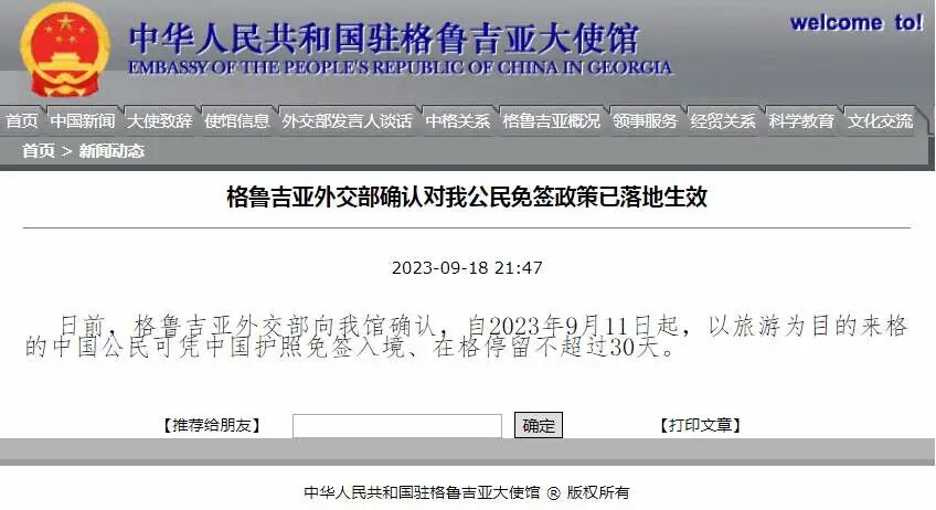 中国大使馆证实:已免签 2023-09-19 16:14 中国驻格鲁吉亚大使馆 0 格鲁吉亚外交部确认对中国公民免签政策已落地生效 日前,格鲁吉亚外交部向中国驻格鲁吉亚大使馆确认,自2023年9月11日起,以旅游为目的来格的中国公民可凭中国护照免签入境、在格停留不超过30天。